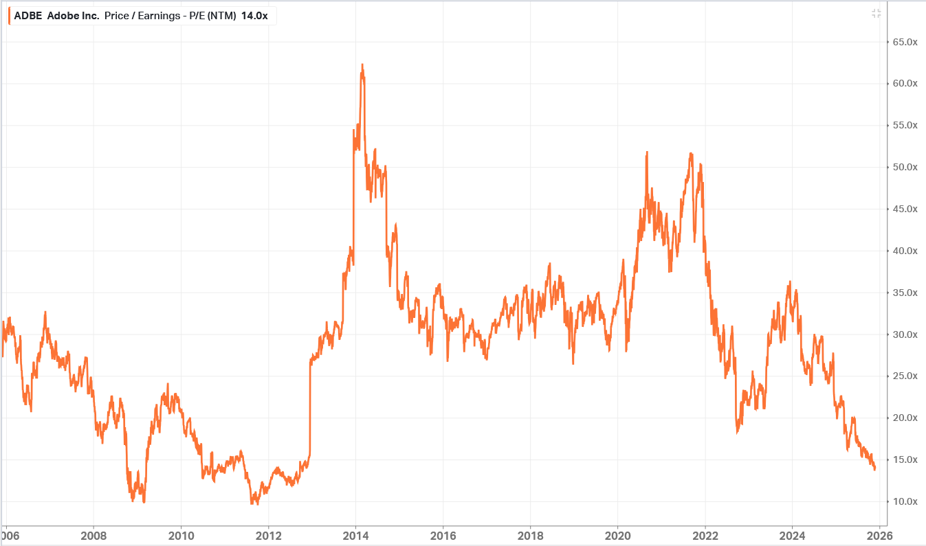 For decades, Adobe was the undisputed king of the creative economy - a software compounder with a wide moat, sticky enterprise customers, and pricing power that few could rival. Yet, throughout fiscal 2025, a dissonance has emerged. Adobe, consistently across Q1-Q3, continues to post double-digit revenue and EPS growth and beat earnings targets, but its stock remains under significant pressure, trading at multiples that suggest its best days are behind it (now 14x forward P/E vs most of the last decade above 30x).