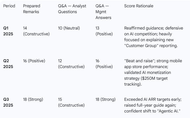 Q1 2025: The focus was on “Generative AI” and “Firefly” as a novel creative tool. Management introduced a new reporting structure (”Customer Groups”) to highlight growth in non-creative segments, perhaps anticipating weakness in the core?.