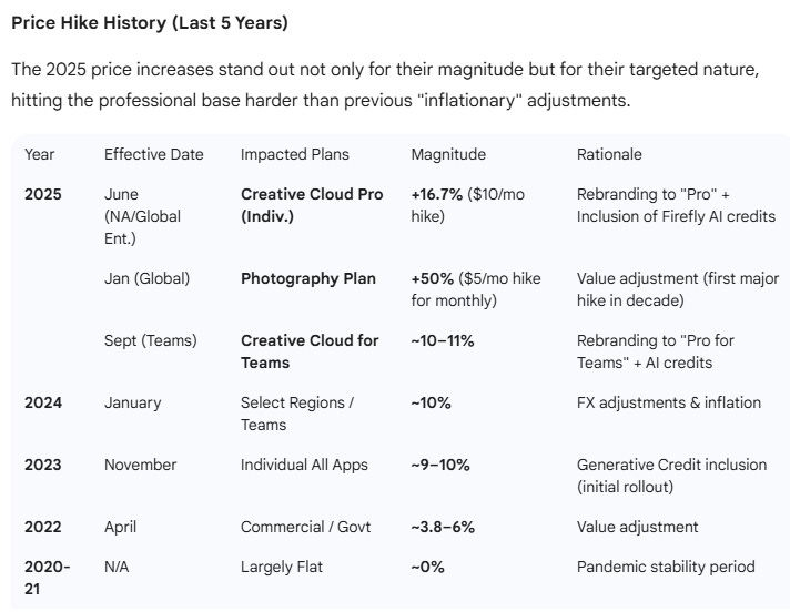 Pricing Actions: Adobe implemented aggressive price hikes in fiscal 2025. This included a ~16% increase on Creative Cloud Pro plans (effective June 2025) and a 50% hike on the Photography plan (effective January 2025).