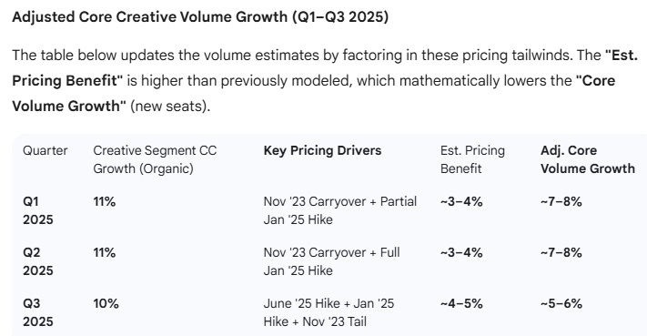 Reported CC revenue growth for the creative segment in Q1 was 11% with an estimated ~7-8% being adjusted core volume growth. By the time of Q3, this analysis shows core volume growth having slowed to 5-6%. Its still growth, but it feeds into the bear case narrative.