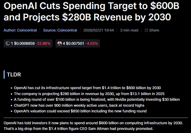 A couple of days ago OpenAI quietly walked away from their $1.4 trillion AI infrastructure spending plans. Whether through investor pressure in order to secure a reported $100bn equity raise or simple realization that they would never be able to fund the spending, that spending plan is now reduced to $600bn out to 2030 - a massive 57% or $800bn reduction. I suggest here that there are multiple reasons this has occurred and that taken together they are an important signal that lasting market regime change is upon us.