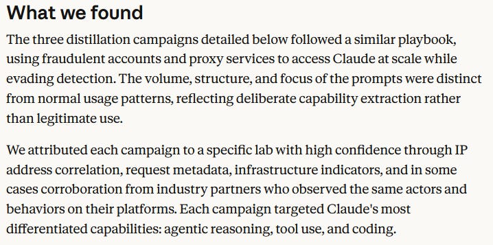 Chinese LLMs are stealing capabilities from Frontier US models at a fraction of the cost of self development. We’ve all heard of Deepseek’s success at building a low cost, high reasoning LLM. Then there was Kimi and even more recently Minimax. Now Anthropic, OpenAI and Google have all disclosed this week that the Chinese LLMs have been distilling their models as training data to support their low cost models that offer API prices at 1/6th to 1/20th the cost of US LLMs. The press release below (link at end) from Anthropic only a day ago highlights the vulnerability and questionable long term economics of the US Frontier LLM premium infrastructure models. When competitors can seemingly just steal your data and build a replica for 1/100th the cost, is there any moat to speak of? AI startups are using models like Deepseek to build their capabilities due to its price/value offering. Companies that have chosen to partner with the high cost models will increasingly be forced to question whether the value they are extracting is sufficient when alternatives exist that are a fraction of the cost. Large corporates may not trust Chinese AI, but what if the next Deepseek actually comes out of the US? (hint: its already happening with Reflection AI). In a normal industry, massive capital requirements form a barrier to entry. Here it simply appears to be a tax on those creating the real IP that others can take advantage of. That’s not sustainable and would play out in medium term revenue growth forecasts being missed and infrastructure spend being slowed (wait - hasn’t OpenAI already “opened” that door?).