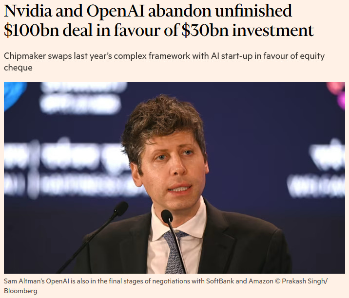 NVIDIA, OpenAI’s major backer and key supplier, cut its original appetite for investments in OpenAI from $100bn (medium term commitment) to “up to $30bn” in this latest round, signalling unease with the concentration and duration risk inherent in OpenAI’s unfettered growth strategy and potnetially also the success of their competition.