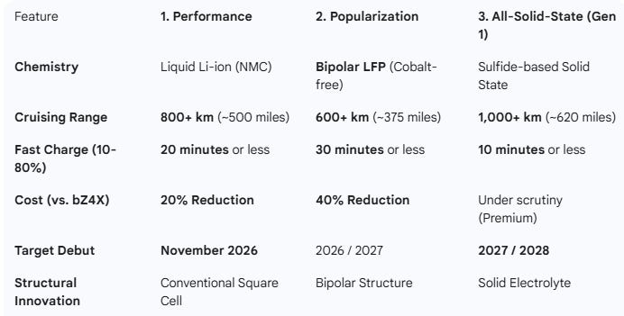That strategy is at the core of getting the cost down for ASSBs (experience curve and shared infrastructure) ahead of what would otherwise be possible if they eschewed liquid batteries entirely. It also de-risks the strategy should further technical challenges be met in the SSB timeline to mass production. The last point is that Toyota has already teased further plans for a Gen 2 SSB with 1200-1500 km range.