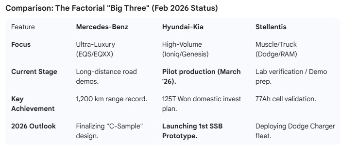China is not sitting out of the SSB industry as it clearly represents a huge challenge for their massive Li-ion battery manufacturing infrastructure. While progress is far more opaque, Dongfeng and FAW Group announced this month (Feb 2026) highly aggressive timeframes. They have indicated that they have already begun installing 500 Wh/kg semi-solid batteries in test vehicles with a target for mass production as early as September 2026. This puts immense pressure on the Hyundai-Factorial alliance to accelerate their B-sample to C-Sample transition while also reinforcing the lack of testing done in some Chinese companies. Of course, these are semi-solid, not ASSBs.