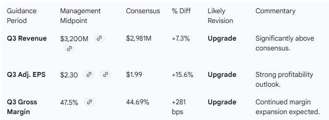 Guidance Implications: Strong Upgrades Expected. Q3 guidance midpoints for Revenue ($3.2B) and EPS ($2.30) are significantly higher than the current consensus.