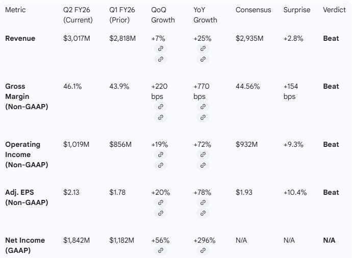 Q3 Guidance YoY: Guidance of $3.2B implies ~40% YoY growth (vs. $2.29B in Q3FY25). This is a massive acceleration compared to the ~25-27% seen in the first half of the year.