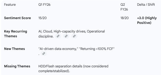 Management Discussion (Prior Quarter): In Q1, the narrative was centered on the initial “strong demand environment” and the immediate success of the HDD/Flash separation. There was a heavy emphasis on innovation and “operational discipline” as the primary tools to capture new AI opportunities.